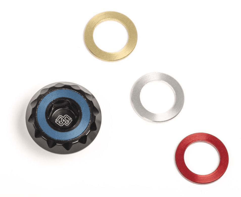 CNC-machined, black anodized aluminum main body with inlays in silver, gold, red and blue